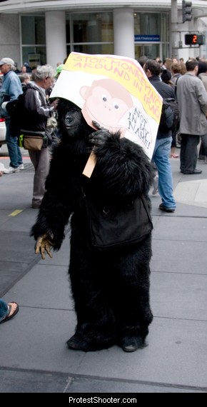 Those green anti-Chevron signs were recycled from a protest over the weekend at a refinery. Note the slogan "No War No Warming No Empire" - basically all of mankind's ills can be traced to oil companies.