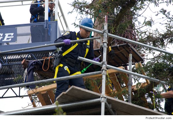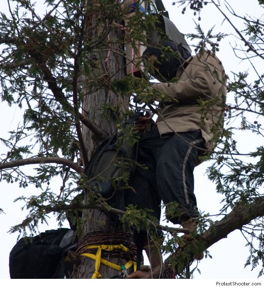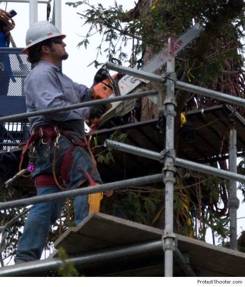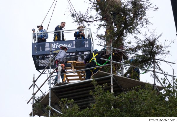 Update2: Zombie has an excellent report up now, and it focuses a bit more on all four sitters coming down. KTVU has a nice video up that shows the tree coming down. Notice how it also shows interviews with folks like Zachary RunningWolf - compare how they portray him to in a calm interview but don't show him ranting like a lunatic as in my video.