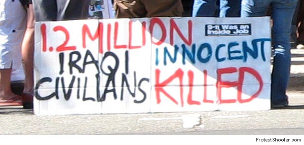 Here's that bumper sticker just in case nobody believes me. Oh, and if you're wondering where the 1.2 million figure comes from, I have no idea and I hunted around a bit. Even if you take the seriously flawed moonbat funded Lancet study, and asssume the same rate of deaths to this day (you know, despite the surge and all) - and there are websites that do that same crazy jump - you don't get that many deaths. But I've noticed there's a kind of stats inflation on protest signs, and every time I see a figure it's bigger than last time. Trying to apply logic to this stuff can drive you crazy so I'm just going to leave it at that.
