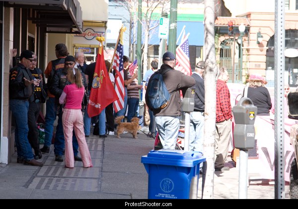 Now, if you're taking a count - the guy with the yellow sign is with ANSWER, and everybody in the background you see who is male is a pro-Marine biker guy. They'll split out later so we can get a count. You can really see the bullpen here.