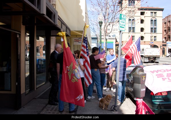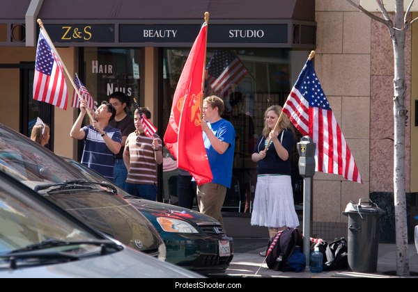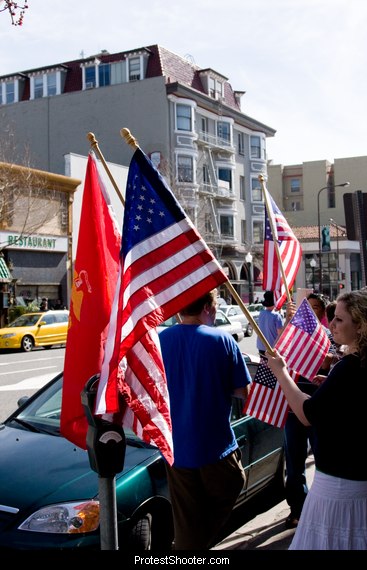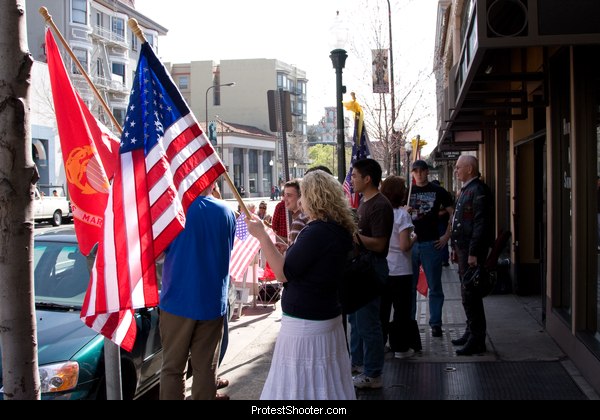 So where's the community support for the anti-Marine side? I sure don't see any. And again, this is when they have the permit, this is when they have the free parking spot. This is the absolute peak time for Code Pink. You'll see maybe one of them on Fridays when World Can't Wait is protesting (and even then, there were three kids from Berkeley High out to support the Marines). But the best they can muster during their peak time is a half dozen founders and bigwigs and some guy from ANSWER who happened along at that time? Sad.