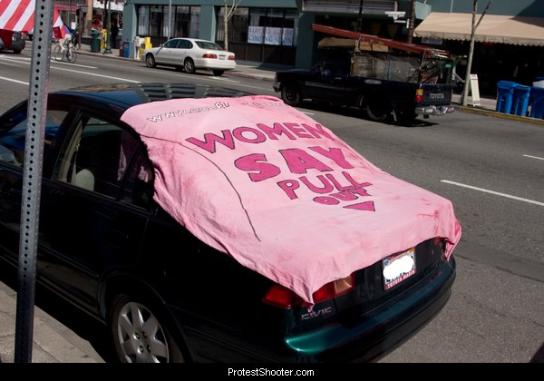 Classy. Code pink caters pretty much to middle aged women. You'll see an anti-Marine guy in a bit but he's with ANSWER. Notice I'm a nice guy so I erase even Moonbat license plates, but I think it's funny that it's from a Marin county dealership. Marin's a fair drive from Berkeley - I wonder if they're locals or not?