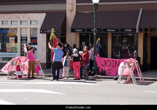 OK, so from the left. The biker dudes are pro-Marine. The gal in pink is Medea Benjamin who is a code pink bigwig. There are more pro-Marine protesters in back. The rest of the code pink forces are out into the street - they're using the parking spot to protest in, not to park. We'll call that area the bullpen.